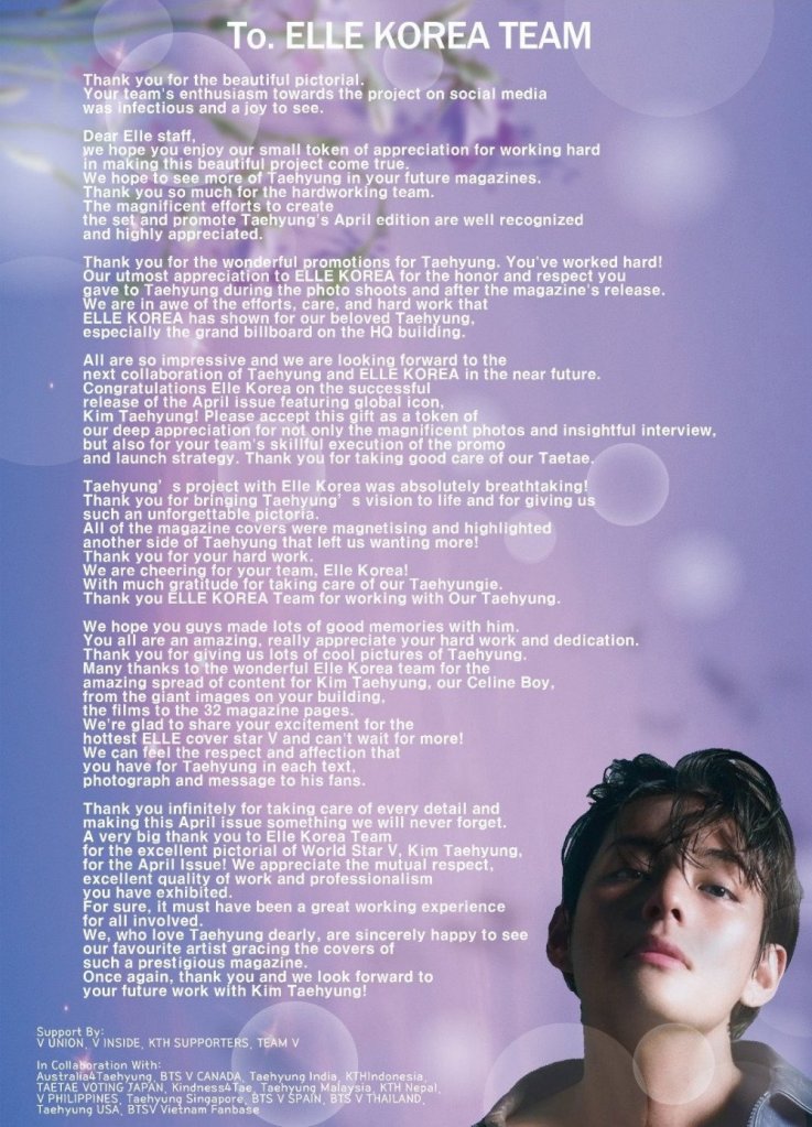 احتفالًا بقضية ELLE Korea التي نالت استحسانًا كبيرًا في أبريل 2023 والتي ظهرت فيها “المدمرة من النوع V” الساحرة ، نظم معجبو تايهيونغ المخلصون لفتة تقدير كبيرة.