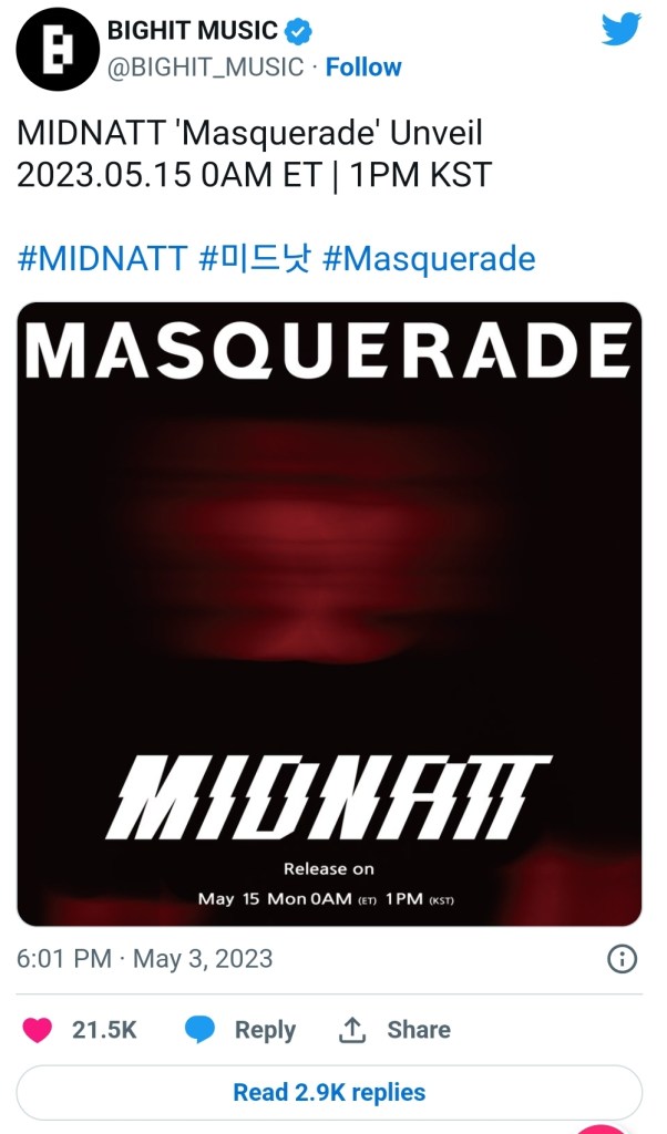 الآن ، أصدرت HYBE إعلانًا تشويقيًا جديدًا لفيلم MIDNATT “Masquerade” الرسمي – لحظات حساسة ، والذي سيصدر في 15 مايو. هل أغنية “Masquerade” أغنية جديدة؟ من أو ما هو هذا MIDNATT الغامض؟